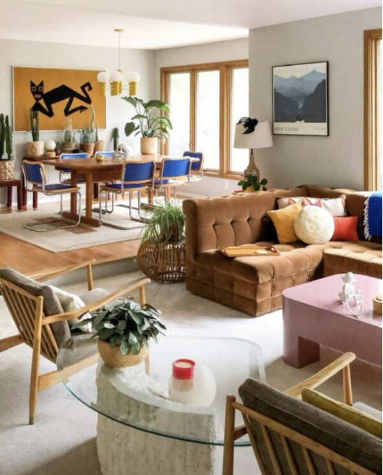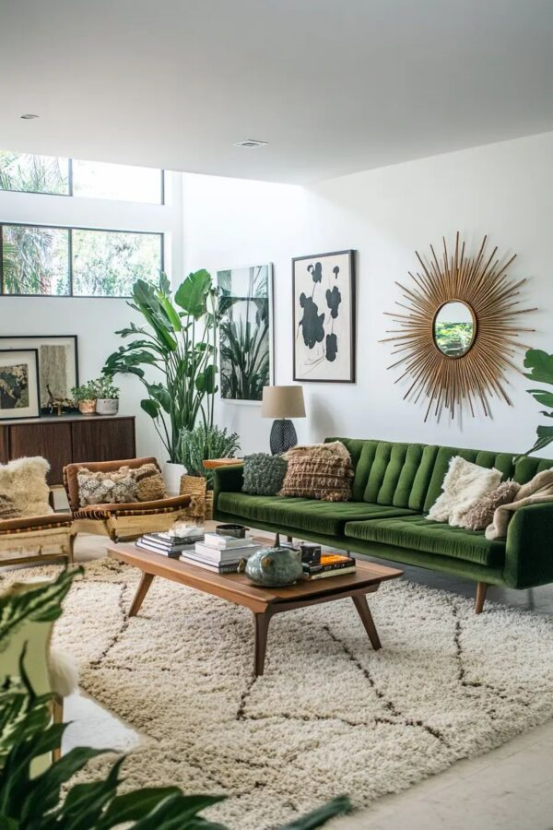 将户外引入室内是中世纪现代生活的核心。琴叶榕、虎皮兰和龟背竹等室内植物不仅增添生机,也增强了空间的有机流动感。将绿植与陶瓷或木质花盆搭配,以忠于该风格。如果你有幸拥有大窗户,让自然光最大限度地照射进来,使用极简的窗帘处理。受自然启发的艺术品、石材点缀,或者甚至餐桌上一碗简单的水果,也能呼应这一理念。自然增添了宁静感,并使室内感觉更具连通性和活力。