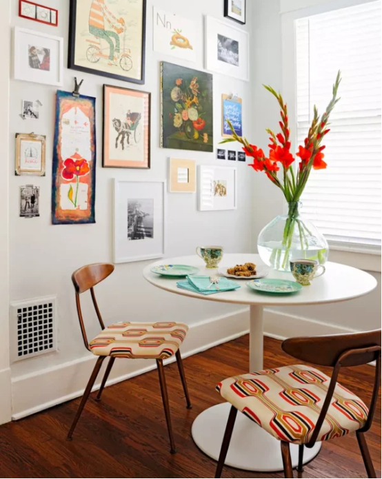 中世纪风格的住宅通常设有舒适的用餐角落,非常适合家庭聚餐或深夜牌局。用一个圆形柱状桌和色彩明快或采用纹理面料的软包椅来重现这种氛围。沿墙放置带靠垫的长椅,增添舒适感和亲密感。在头顶悬挂一盏吊灯——选择有雕塑感且光线温暖的款式——将所有元素联系在一起。结果如何?一个功能与风格兼具的角落,让用餐时光充满庆典般的愉悦,并洋溢着复古风情。