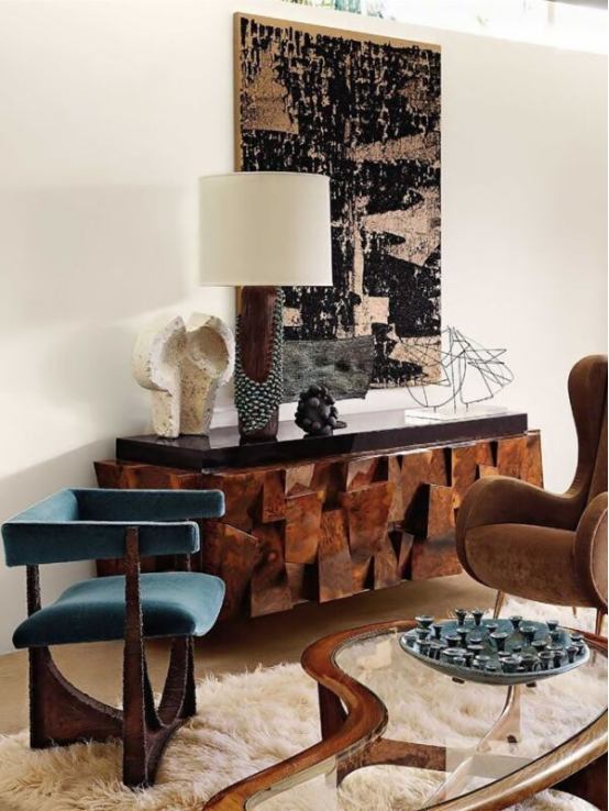 中世纪现代设计鼓励叠搭,但并非杂乱无章。它关乎于深思熟虑地混合形状、纹理和尺度。想象一个光滑的木制餐边柜,上面摆放着一盏黄铜灯、一个陶瓷花瓶,上方悬挂着一幅大胆的艺术品。在下方铺一块图案地毯,附近放一把雕塑感椅子,你瞬间就构建出了深度而非混乱。每件单品都与其他单品相得益彰,创造出一个感觉是经年累月收集而来、而非刻意装饰的房间。这种分层手法让你的空间在保持和谐的同时,视觉上始终有趣。