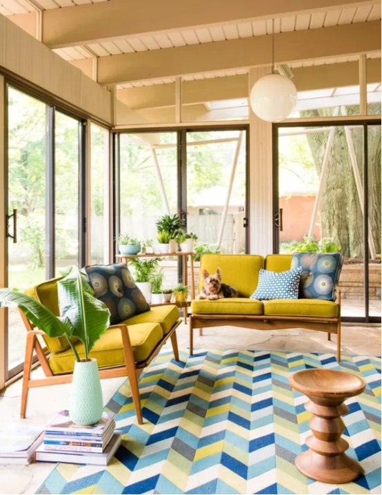 一块精心挑选的地毯可以稳定整个房间,并将所有设计元素凝聚在一起。中世纪地毯通常以大胆的几何图案、抽象主题或中性色调的简单纹理为特色。无论你偏爱长绒地毯以彰显复古风情,还是喜欢平织地毯以追求极简外观,地毯都能在开放式布局中界定区域,并为脚下增添温暖。这是在空间中融入纹理和色彩的简便方法。将其铺在咖啡桌下、餐桌椅下,甚至卧室里,都能瞬间提升设计感。