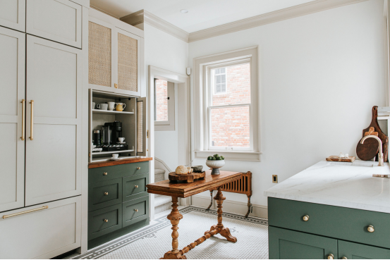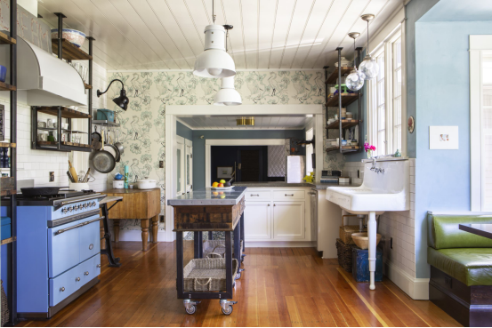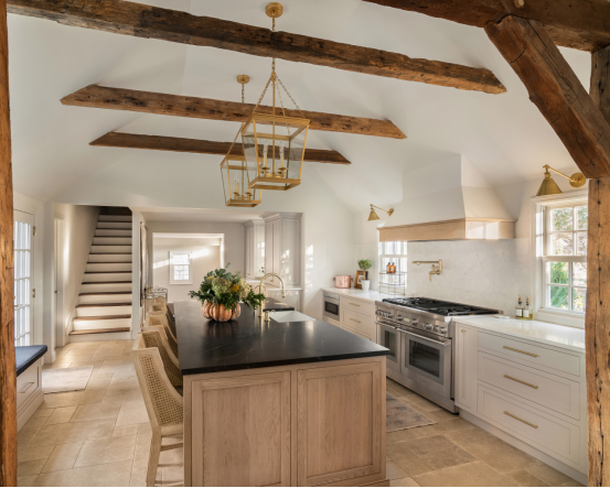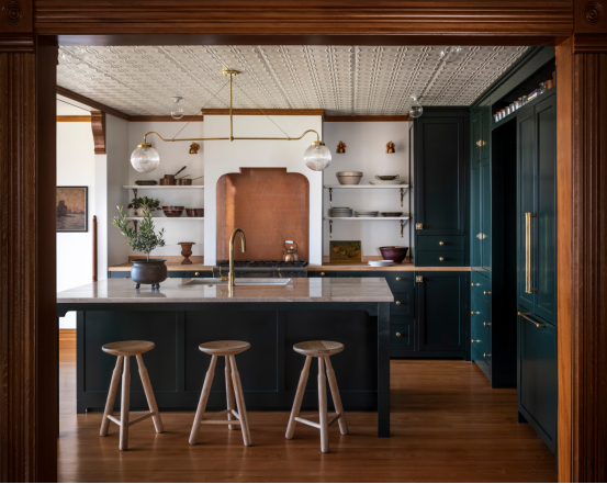 除非您的目标是精确的历史修复,否则您无需牺牲现代厨房的优势来获得旧式的、非整体式的感觉。可以将一个独立的岛台或餐具柜与固定的底柜搭配,引入一个复古橱柜用于储物,或者混合使用油漆和染色饰面,让房间感觉是随时间逐渐收集布置而成的。同时,像冰箱和抽油烟机这样的大型现代电器可以加装面板,使其与橱柜融为一体。