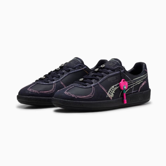 PUMA 与《鱿鱼游戏》的联名合作 捕捉了剧集的黑暗氛围,但又没有过于直白。Palermo 鞋型采用了阴郁的印花和夜光元素,在灯光熄灭后会活跃起来。那些对儿童游戏的隐藏引用对于剧迷来说是巧妙的彩蛋,而不对称刺绣和扭曲的面板则反映了使剧集如此引人入胜的心理张力。