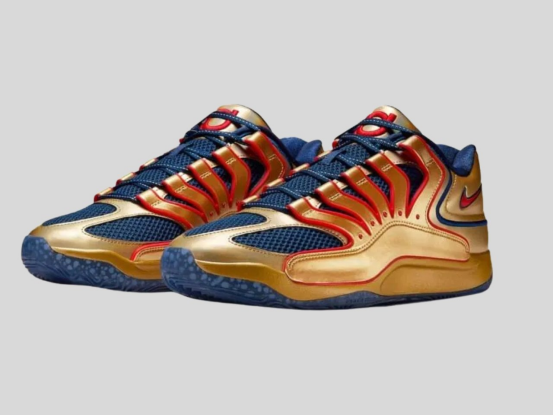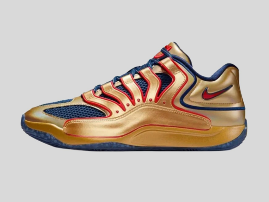 Nike 的 KD 18 "Immortalized" 版本 以一些极其高级的细节向奥运篮球致敬。金属金色在 Blue Void 网眼基底上格外醒目,而大学红色的点缀精准体现了美国队的配色方案。工程网眼保持了透气性和灵活性,而那些造型优美的金色覆盖层在最需要的地方增加了耐用性。整体设计无不彰显奥运的尊贵感,又不会过于浮夸。