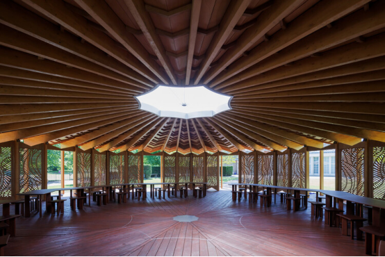 "À Table"是一个法语表达,意思是"吃饭了"或"来桌边"。在这个以纤细木结构建造的展亭内部,一圈桌椅邀请访客进入、坐下、放松、用餐或一起工作。据建筑师所述,设计始于围桌而坐以思考我们与地球的关系,以及我们彼此之间关系的概念。庇护此空间的想法随后产生,旨在保护身处其中的人们,同时保持对周围环境的开放。