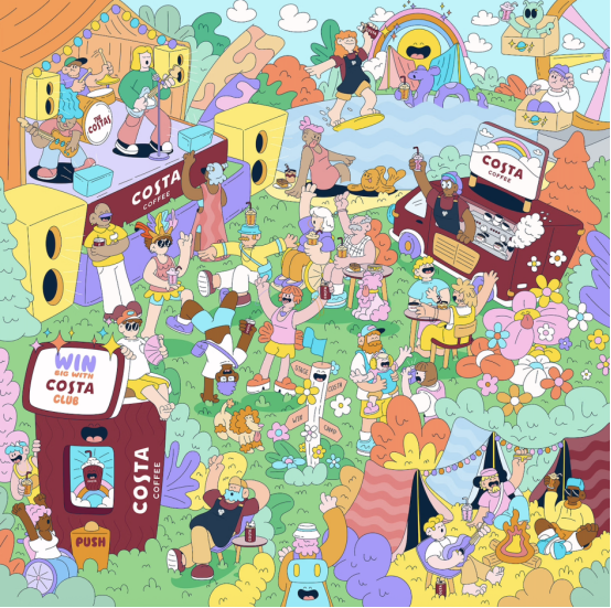 因此,Costa 委托插画师 Luke McConkey 创作了一系列充满活力的艺术作品,这些作品成为他们在节日现场呈现的核心部分。为了契合活动的氛围,Luke 的创作方式非常自然而有机。"我就像是让事情自然发生,就像你在节日现场的感觉一样,"他解释道。"所有事情同时发生,一件事的发生是因为另一件事已经发生了。"