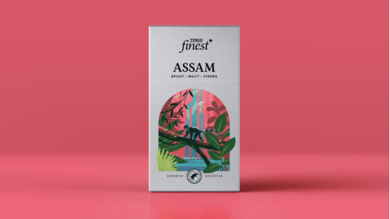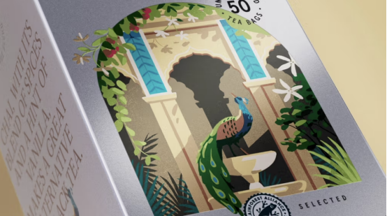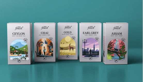 超市包装通常优先考虑功能而非形式。但连锁超市 Tesco 的 Finest 茶系列打破了这一惯例,他们委托 Tom Haugomat 创作了五幅以目的地为主题的插画。Tom 与设计公司 Coley Porter Bell 合作,创作了充满活力且富有浪漫色彩的图像,将消费者带往世界各地的茶叶产区。