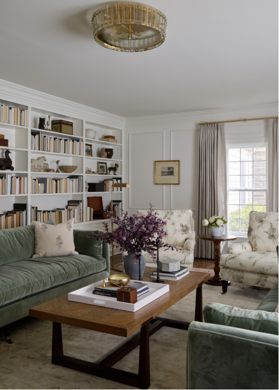 Laura Design Company对这座位于伊利诺伊州韦恩市的客厅进行了优雅升级,传统细节平衡了精致与舒适。墨绿色天鹅绒沙发和花卉卷臂椅环绕深色木制咖啡桌,营造出便于交谈的氛围。装满书籍的嵌入式书架和装饰性墙板为房间增添了建筑般的庄重感,而黄铜点缀则带来一丝微妙的光泽。
