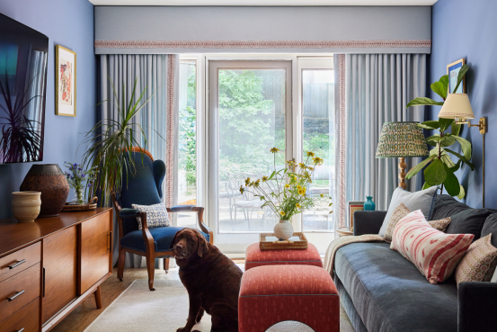 这间位于纽约哈德逊河畔黑斯廷斯住宅的业主与Rachel Gedymin Design合作,基于他们对英式室内设计的热爱,打造了一个色彩缤纷、温馨且充满朝气的家庭活动室。使用Houzz Pro软件进行发票、账单和项目管理的Gedymin精心挑选了纺织品和点缀——包括"醒目"的凳子和奢华窗帘及盒式檐口上的装饰 trim 带——"以确保房间脱颖而出,"她说。