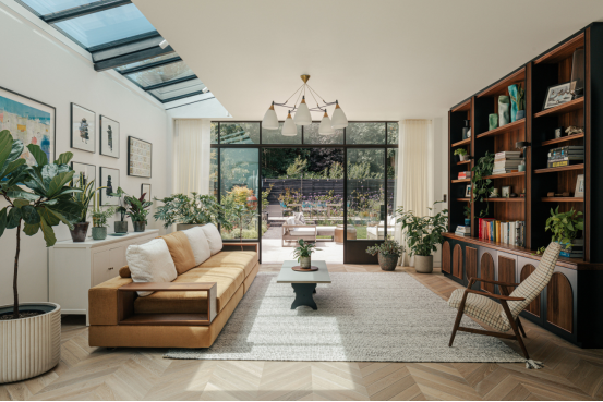 这间由Rider Stirland Architects设计、配有Black Steel Doors的玻璃门和窗户的伦敦客厅,融合了不同时代的家具和建筑元素,包括一个带有新艺术风格韵味的深色木制书架单元。丰富的绿叶植物点缀着这个温室般的空间,它们在透过玻璃门和天窗倾泻而下的阳光下茁壮成长。