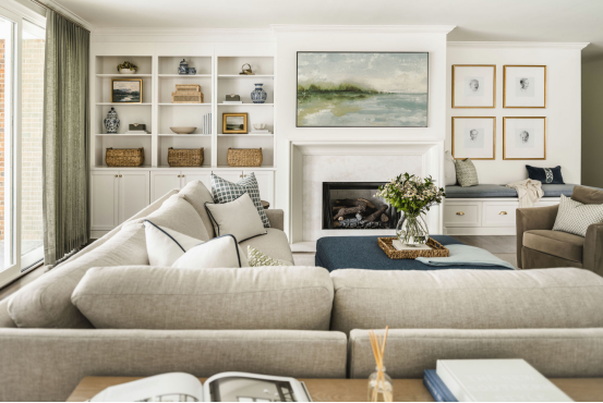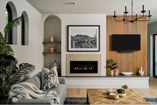 Kelley Design Group的Traci DiGiorgio-Kelley布置了这间位于德克萨斯州奥斯汀的新建样板房的客厅,其特色旨在吸引成长中的家庭或年轻专业人士,包括自然的色彩和纹理、简洁的线条、燃气壁炉以及高拱形窗户,这些窗户在保护隐私的同时让阳光充满空间。一面温暖的白橡木特色墙在视觉上提升了房间的高度,而嵌入拱形壁龛的匹配架子则提供了实用的展示空间。
