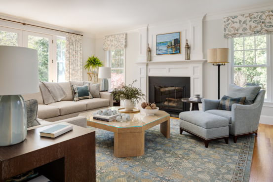 在马萨诸塞州康科德的一处经典木瓦住宅中,Betsy Bassett Interiors以过渡性的新英格兰美学更新了一间客厅,并为成年子女、他们的伴侣甚至家庭宠物提供了充足的座位。使用Houzz Pro软件管理项目并与客户沟通的Bassett,用一块柔和的多色地毯稳定了房间,并选择了协调的纺织品,包括蓝色和米白色的高性能面料以及定制花卉窗帘。一个大型编织拉菲草咖啡桌提供了额外的质感、风格和功能。