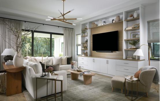 通过设计定制的白色内置储物柜,将电视安装在白橡木背景墙上,Leah Weinberg Design在佛罗里达州棕榈滩花园的一处新建住宅客厅中,创造了建筑趣味、储物空间和家庭聚会的焦点。柔软的法兰绒软包、橡木色调和亚麻窗帘,采用奶油白、柔和灰褐及暗绿色的中性色调,增添了质感并反映了住宅阳光充足、绿意盎然的环境,而一盏现代枝形吊灯则提供了时尚的、雕塑般的点缀。