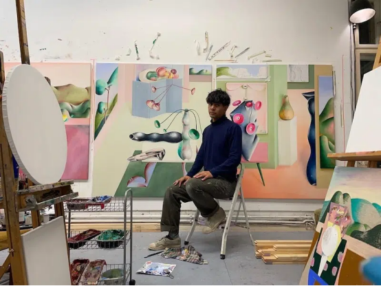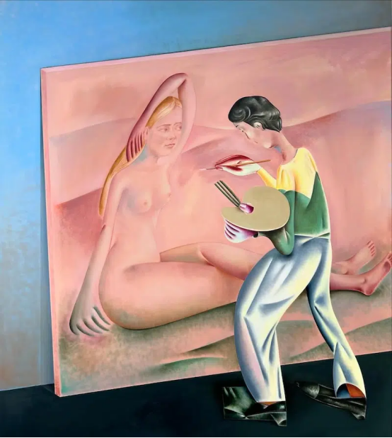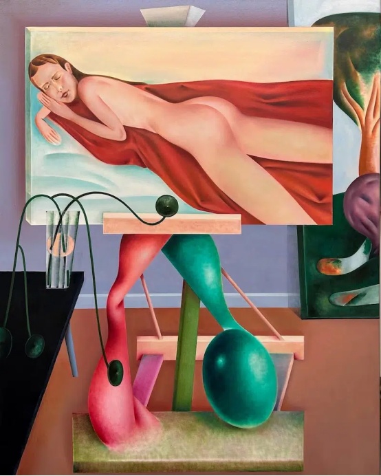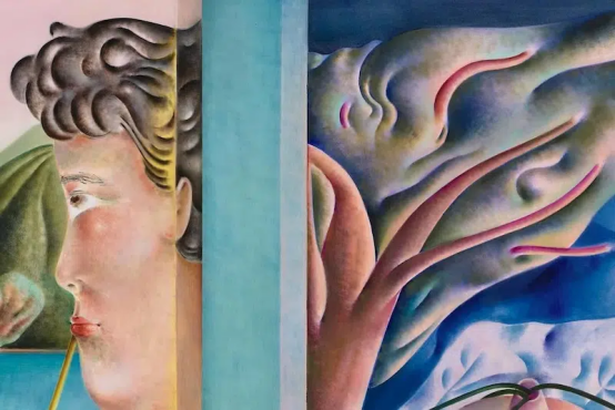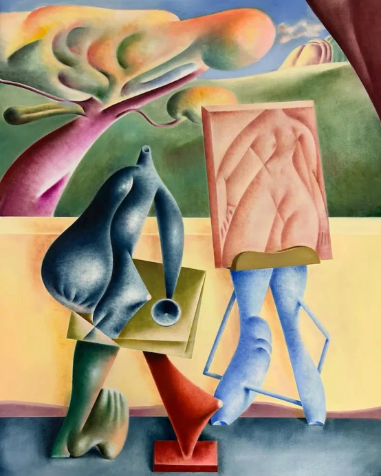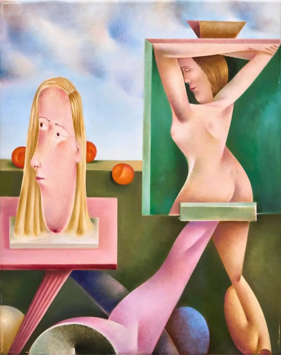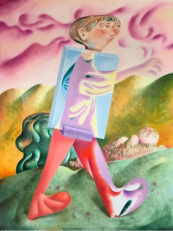 弯曲、脱节且如丝绒般的形式,描绘着不受规则束缚的、不成比例的人物、风景和熟悉物件。