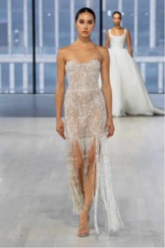 婚礼后的派对,小心了!明年的新娘可以借鉴泰勒·斯威夫特流行的"歌舞女郎的生活"美学,穿上充满羽毛、流苏、亮片和珠宝装饰的迷你裙。一个完美的例子?来自妮可+费利西亚十周年时装秀上的这款水晶珠饰惊艳之作,该品牌是斯威夫特的最爱,她在"时代"巡回演唱会中曾穿着三套该品牌的礼服进行表演。
