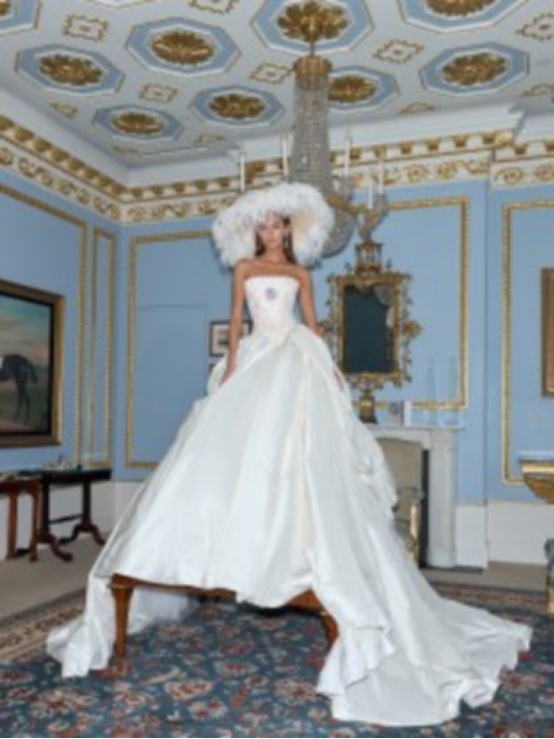 将流行三人组变成四重奏的是本季的另一位明星:玛丽·安托瓦内特,她并非职业音乐家,不过众所周知她会演奏竖琴。随着维多利亚与阿尔伯特博物馆记录她在时尚史上遗产的展览在伦敦开幕,裙撑、蓬松发型和洛可可风格的装饰元素主导了春季成衣秀场,而将这些相同元素融入新娘礼服似乎是一件水到渠成的事。毕竟,每个女孩都值得在她特殊的日子里感觉像一位女王。