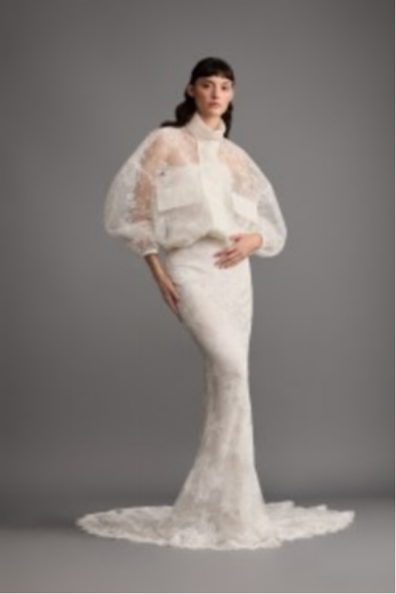 虽然蕾丝作为现代婚纱的主要趋势持续盛行,但像吉尔斯之家、马克里安、Kyha等品牌将这一经典浪漫的外观更进一步,通过将蕾丝材质融入出人意料的廓形中,包括 bomber 夹克和两件式套装,来装扮她们2026年新娘的整个婚礼周末衣橱。