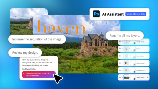 Adobe 同样难以忽视的是 ChatGPT 的崛起,它现在可以根据请求进行图像编辑等操作。为应对这一挑战,Adobe 正在其创意应用中全面推出对话式聊天机器人。换句话说,你无需再点击菜单,而是可以用简单的英语告诉 Photoshop 或 Express 你想要什么,它就会执行这些步骤。