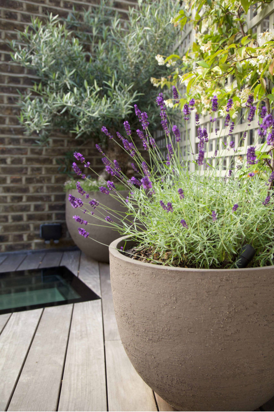 "您可以通过摆放植物将自然带入您的户外空间,即使只是一个很小的门口区域," Gold 说,她为自己花园选择的香味植物是茉莉。在图中这个伦敦的屋顶花园里,Jonathan Snow Design 在花盆中种植了薰衣草和茉莉。为您的户外空间增添芬芳,可能只需要投入一株植物和一个花盆那么少的成本。