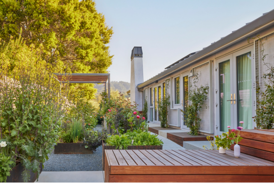 对于图中这个旧金山湾区的院子,景观设计师 Lisa Howard 的客户想要一个多功能的花园,她可以在那里尝试不同的花卉和可食用植物。她还希望这个空间对孩子友好,这样她的孩子们就可以和她一起享受收获香草蔬菜和剪切花卉的乐趣。Howard 规划了这个空间,添加了大型种植箱、座椅、砾石和一个工作台。