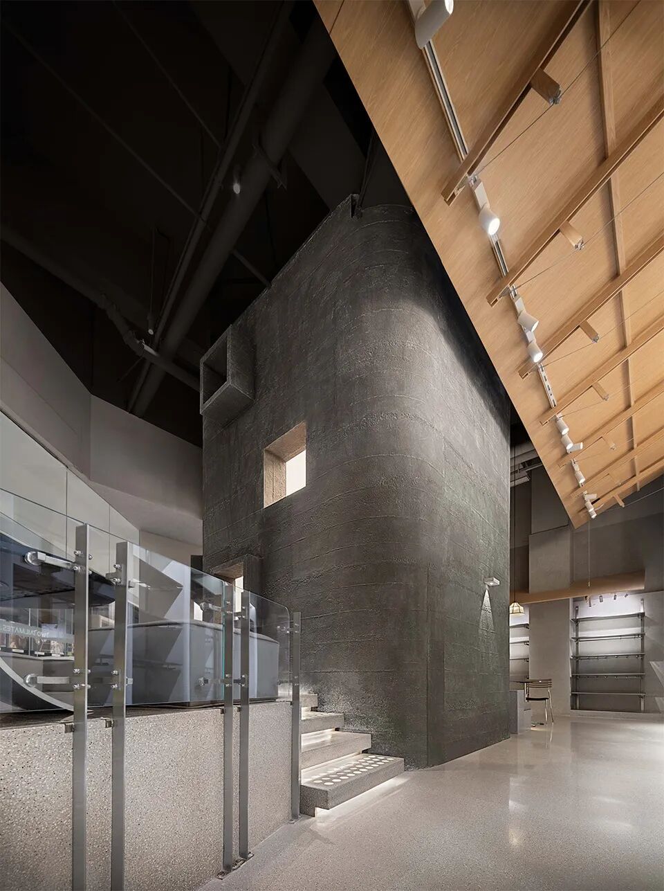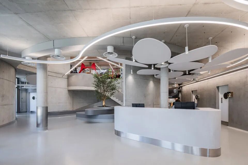 最初看似简单静态的几何形体——植根于空间心理与人类学原则——逐渐展开为一个充满动感的曲线网络,使这里成为一个真正的“场所”,充满生命与流动感。这些流线型的形式消除了人们对封闭空间的原始恐惧,营造出一种开放而自由的环境。
