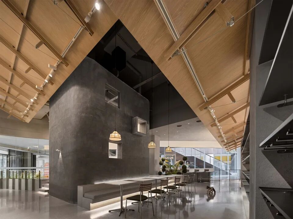 室内的动线围绕核心筒展开,非零售区域整体抬高。这个高差使爱犬在抬高区而主人在非抬高区域时,视线高度会比以往更接近。高低区域组成的洄游动线为爱犬们提供了更具趣味的自由奔跑空间。