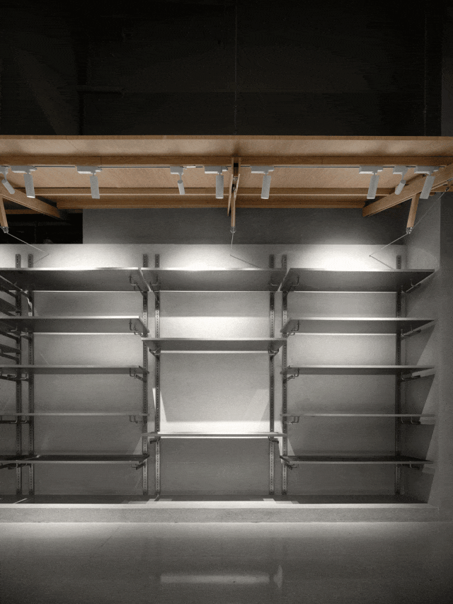动线靠墙一侧满挂货架。由于业主会对零售产品进行换季调整,货架并未采用传统固定式层板或挂杆,所有的层板及挂杆均可随换季而轻松地调整高度及挂杆密度,保证了零售经营策略的灵活性。