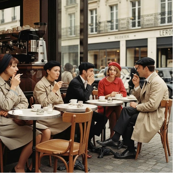 巴黎咖啡馆场景,1960年代,写实复古摄影,新浪潮电影美学,柔焦,自然光,路边餐桌,身着经典60年代时尚服饰的人群,温暖配色,怀旧氛围,胶片颗粒纹理。