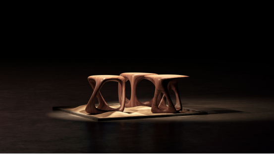叙利亚设计师 Ahmad Kattan 的 Morphcode 系列既具功能性,又具雕塑感,这些凳子或边桌由简单的几何形状构成,并以45度角旋转。作品使用数控机床制作,实心黄松木件"证明了木材在潮湿环境中依然可以发挥作用," Kattan 解释道。