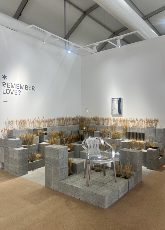 Badih Ghanem Architecture and Design 也邀请参观者回首往事,'Remember Love?'。这位法籍黎巴嫩建筑师展出了五件由抛光钢制成的作品,让人回想起家庭庆典时总会拖出来使用的 ubiquitous 椅子。那些花瓶,其灵感来源于2022年爆炸后小麦散落全城的贝鲁特港筒仓,或是代表众多战后未完工房屋的煤渣砌块。"这是关于花时间与我们遭遇的一切共存,我们带着伤痕生活。"那面镜子由单块材料自身折叠形成镜框,初看扭曲,当你靠近时,事物变得清晰,有点像我们的记忆。"