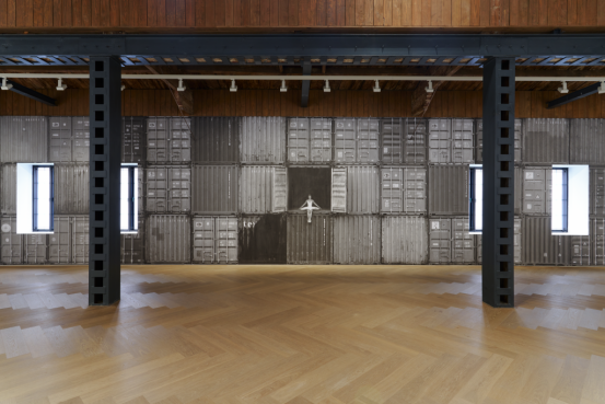 在上海,JR没有在墙上悬挂带框的作品,而是将贝浩登一个带窗的房间改造成了一面墙的整体装置,展示着一幅舞者端庄地坐在层层堆叠的集装箱中央的独幅照片。展出的其他作品也打破了人们对表面的预期。一件作品模仿了纸张的褶皱——其刻意营造的不均匀纹理给人一种纸张漂浮在画廊墙壁上的错觉。"那是我手工制作的,"JR告诉我,"所以它承载了墙壁本身的连续性。"