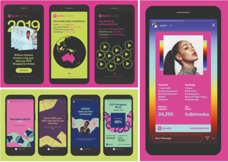 2020年,渐变色调被重新引入(一直很受欢迎),但结合了更多的互动性,包括小测验、徽章和故事。到2021年,Spotify创意团队似乎被给予了更多自由发挥的空间,美学采用了自由风格,融入了拼贴图形和动态图案。