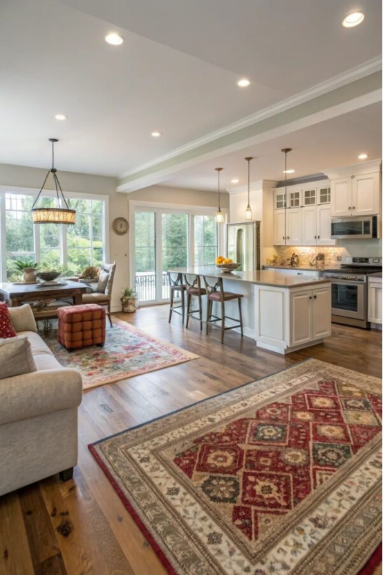 地毯是最简单且最有效的空间划分工具之一。一张宽大柔软的地毯能即刻定义出一个起居区域,在更大的空间中营造出场所感。在开放式厨房里,长条地毯能引导人流;在餐厅里,地毯则固定了桌椅的所在。即使小地毯也能划分出阅读角落或学习角落。图案、材质和尺寸可以变化,但关键在于协调——选择相互和谐而非相互冲突的地毯。仅凭布料和地板,你就能在你的开放式布局中巧妙地"勾勒"出一个个房间。