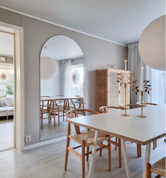 大型镜子不仅反射光线,还能创造出有意的边界,加深开放式布局的结构感。在区域的边缘放置一面有特色的镜子,能立刻定义该区域并在视觉上扩展它。餐桌后方的镜子增强了它的存在感;入口附近的镜子提供了一个自然的过渡点。镜子帮助锚定空间而不增加体积,非常适合需要微妙分隔的开放式公寓或现代住宅。它们的反射特性增添了优雅感,同时支持功能性的区域划分。
