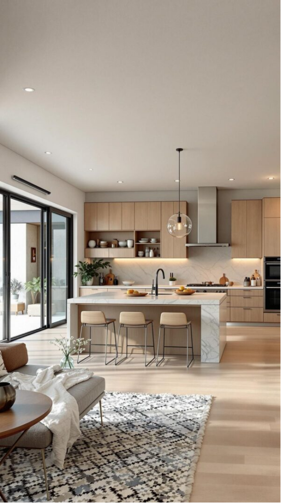照明是开放式平面中划分区域最有效且最美观的方式之一。一盏枝形吊灯锚定了餐厅区域,吊灯定义了厨房岛台,分层布置的灯具为生活空间带来温暖。每个区域应有自己的照明特色,但所有灯具必须在风格或色调上感觉相互联系以保持和谐。照明有助于用情感上的清晰度建立"房间":明亮的用于烹饪,温暖的用于放松,集中的用于用餐。这是通过氛围而非建筑来划分区域,它将开放式生活转变为一个连贯的体验。