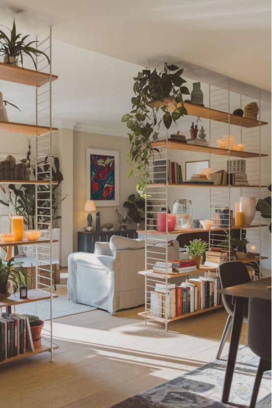 书架,无论开放式还是封闭式,都可以充当时尚的非墙体分隔物,既能划分大空间,又能让光线通过。放置在起居区和餐厅区之间的开放式书架增加了结构感而不阻挡视线;一个通高的单元可以创建一个半私密的工作区或阅读角。在书架上摆放书籍、陶瓷和绿植,赋予分隔物个性,并增强房间的设计特色。书架非常适合那些想要边界但又希望家感觉通透、灵活且视觉上相连的人。