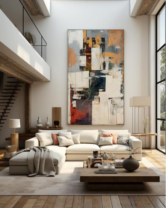 超大尺寸的艺术品通过赋予区域独特的视觉身份,可以瞬间定义它。沙发上方的单幅大画作锚定了起居区;餐桌后方的一幅引人注目的版画标示着该空间的开始;一幅大胆的抽象作品可以为工作区或入口定下基调。大幅艺术品引人注目,让区域间的边界感觉是精心设计的,而非偶然的。它为每个区域增添了个性和情感基调,同时不限制开放性。恰到好处的焦点作品既是焦点,也是空间标记,塑造着房间的能量,而无需物理墙壁。