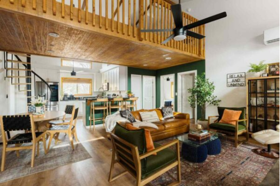 温馨且有意为之的家具组合,是定义开放式平面布局中各区域最简单的方法之一。与其将家具分散摆放,不如将座椅安排成自然形成一个"房间"的格局:一张沙发面对两把单椅,一张圆形咖啡桌将组合向内聚拢,或者一张双人沙发搭配一个柔软的搁脚凳。这些安排有助于视线理解起居区的起止。温馨的组合也为开放空间增添了温暖和亲密感,使其感觉宜人而非空旷。当家具之间有连接感时,整个区域即使没有墙壁也显得目的明确。