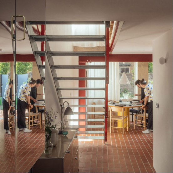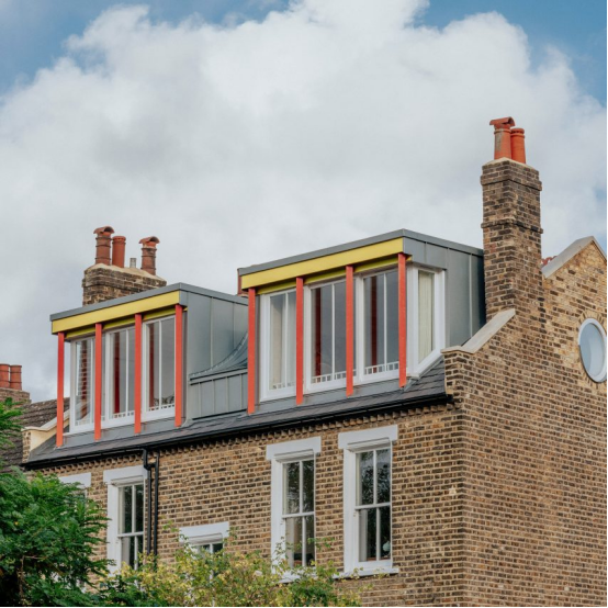 该项目以一对带有红色和黄色细节的柱廊式凸窗为特色,为现有住宅增加了一层额外的空间,并通过一个包含在"锌制弧形结构"内的新楼梯到达。