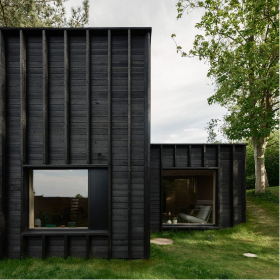 瑞典建筑事务所[Förstberg Ling]使用炭化处理的[松木]覆盖了构成丹麦"House with a Hidden Atrium"的一簇建筑体量。