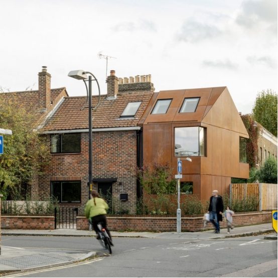 今年另一个受欢迎的项目是 Rusty House,这是对南伦敦一座 1950 年代联排住宅的扩建,外部完全包裹着锈红色的[考顿耐候钢]。