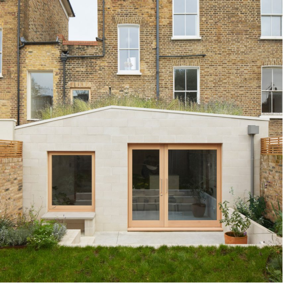 中性色调的混凝土块被用于 Hoj House 这个低矮扩建部分的外部。Hoj House 是伦敦斯托克纽因顿的一处维多利亚时期住宅。