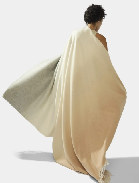 Johnstons of Elgin 的毯子在苏格兰梳理纺制,由来自蒙古和中国的羊绒混纺而成。这家历史悠久的公司始于 1846 年生产用作伪装用的粗花呢,通过将纱线分别染色后再混合在一起,实现了渐变效果。