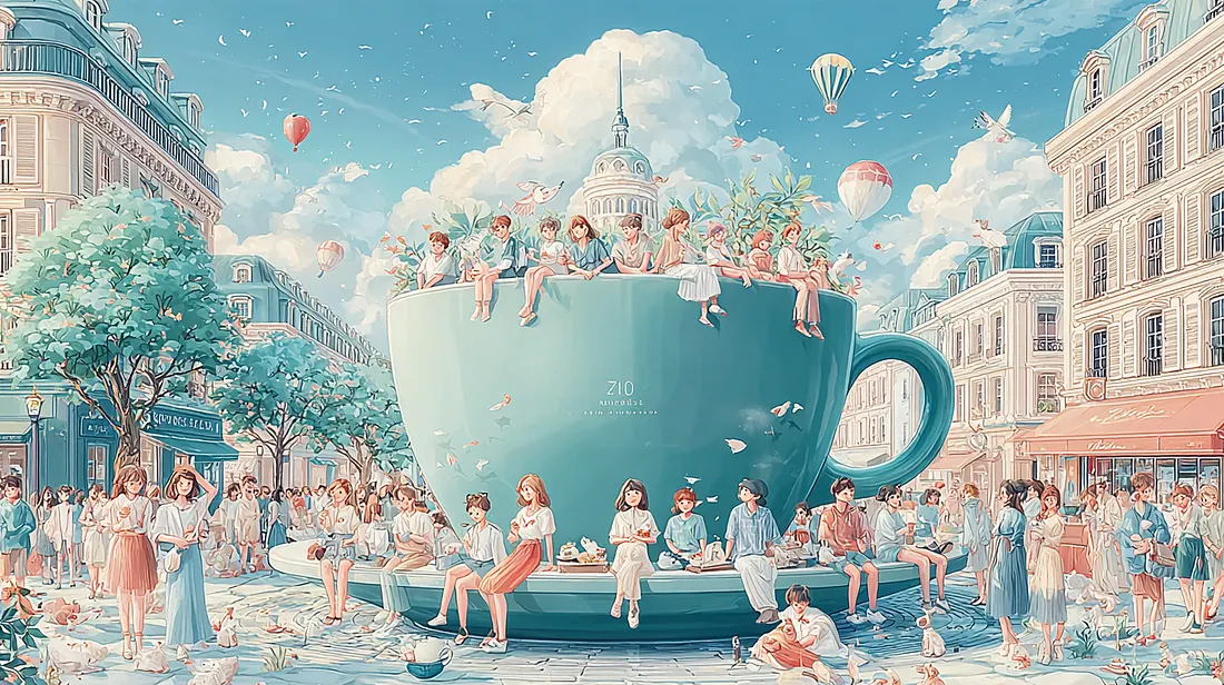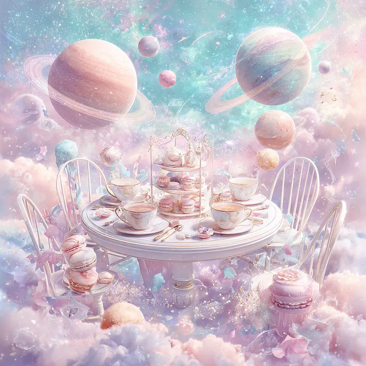 提示: 一张茶桌漂浮在太空中,周围环绕着如茶杯般的行星,如糖粒般的星星,柔和的粉彩银河,梦幻而奇趣,吉卜力工作室风格