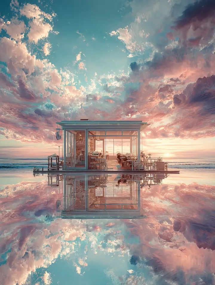 提示: 地点地点被完美地上下镜像,天空化为海洋,海洋化为天空,梦幻的色调,对称构图,电影般的广角镜头,超写实