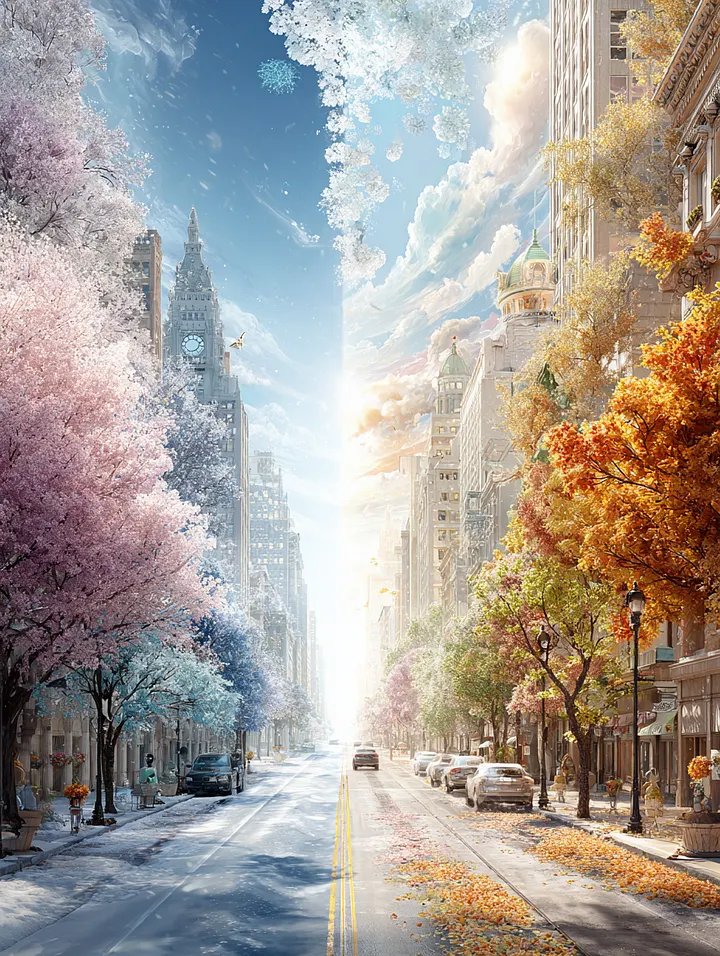 提示: 一条城市街道同时展现四季,从左至右:春日繁花,夏日阳光,秋日落叶,冬日飘雪,电影感构图,超精细细节
