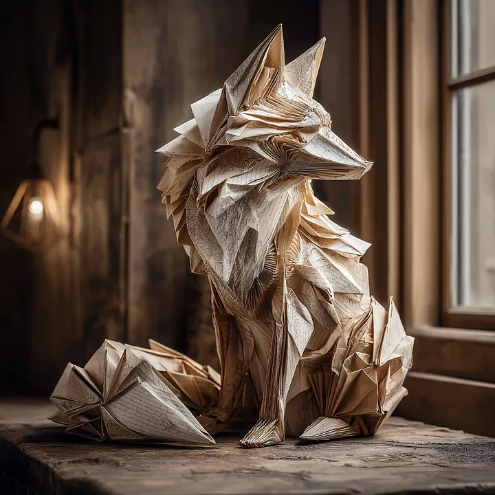 提示: 一只完全由折纸折叠而成的动物动物,放置在纹理清晰的木桌上,柔和的晨光,逼真的纸张细节,优雅的极简主义