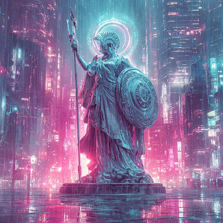 提示: 一尊发光的霓虹神话人物神话人物雕像,赛博朋克城市背景,雨中倒影,戏剧性的电影灯光,蒸汽波色调