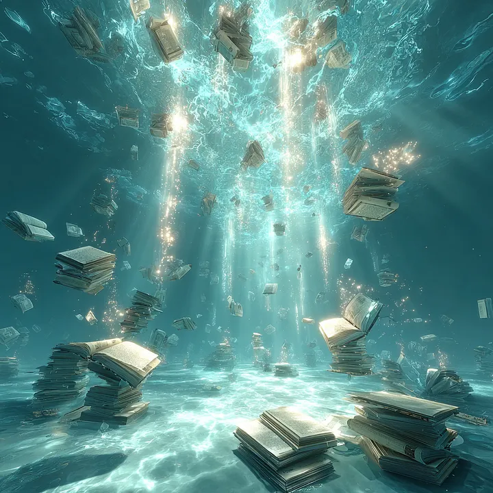 提示: 一座位于海底的图书馆,书籍在水中悬浮,光线穿透水面照射下来,宁静而神秘的氛围,逼真的水体物理效果