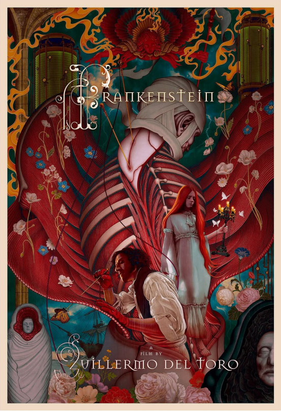 继《水形物语》和《匹诺曹》之后,艺术家詹姆斯·简继续与吉尔莫·德尔·托罗保持创意合作,为IMAX版《弗兰肯斯坦》创作了这张海报。他将影片元素与雅克-法比安·戈捷-达戈蒂的人体解剖艺术交织在一起,呈现出一种绝妙的、发自肺腑的视觉效果。
