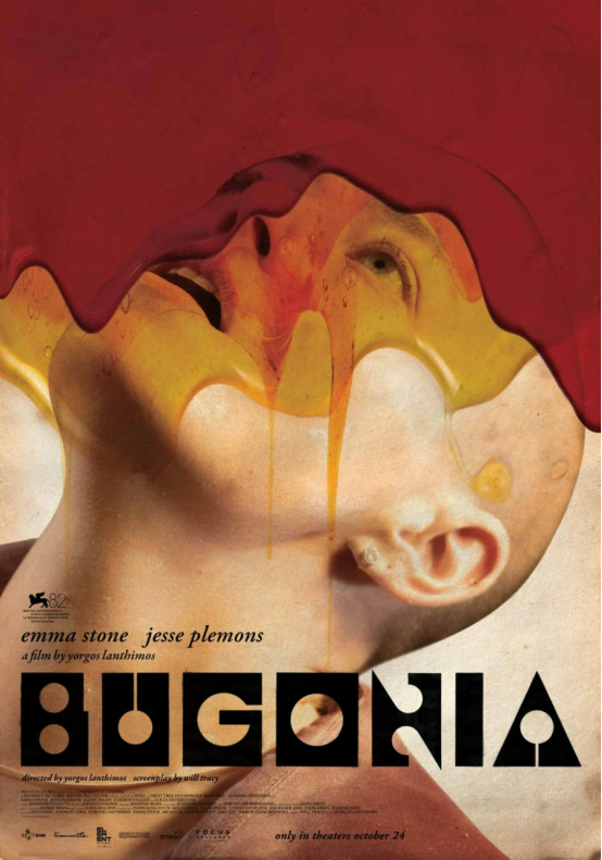 为《布戈尼亚》设计的海报灵感源自片名所指的同名神话:蜂群可能自发地从动物腐烂的躯体中生成。正如马马塔基斯向《Wallpaper》杂志谈及艾玛·斯通沐浴在鲜血与蜂蜜中的形象时所说:“关键在于你无法分辨她究竟是处于绝望之中,还是充满了敬畏。” 结合约瑟夫·丘奇沃德设计的丘奇沃德圆方体字体的复兴,整个作品看起来……极具异星感。